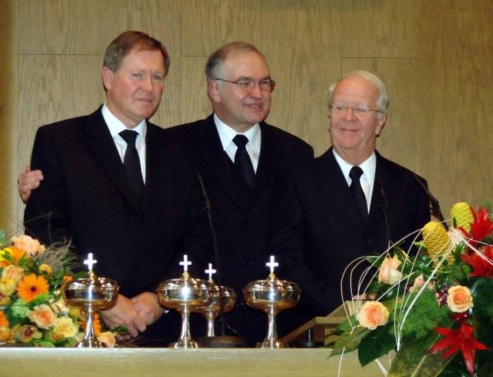 Stammapostel Leber mit Bezirksapostel Fehlbaum (links) und Bezirksapostel Armin Studer (Foto: NAK Schweiz)