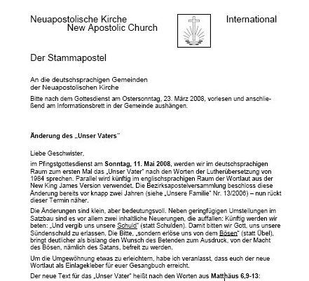 Zürich. Per Gemeindebrief unterrichtete Stammapostel Wilhelm Leber die Gemeindemitglieder der Neuapostolischen Kirche im deutschsprachigen Raum über eine wichtige Änderung: ab Pfingsten, 11. Mai 2008, wird der Text für das „Unser Vater“ nach den Worten der Lutherübersetzung von 1984 gesprochen. In den englischsprachigen Gemeinden gilt ab Pfingsten der Wortlaut aus der New King James Version. Diese Änderungen beschloss die Kirchenleitung bereits vor knapp zwei Jahren.