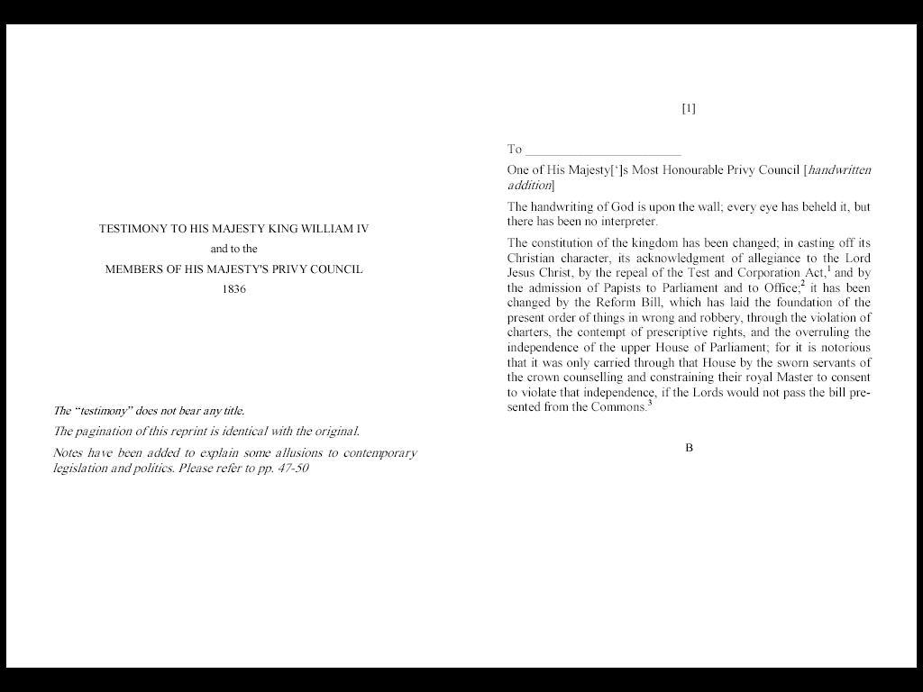 Im Testimonium an den englischen König beklagt Apostel Spencer Perceval (1795-1859) das große Reformgesetz von 1832 als Abkehr von einer Regierung von Gottes Gnaden. Das Gesetz hatte erstmals seit dem Mittelalter den Kreis der Wahlberechtigten auf den Britischen Inseln (auf 7 statt zuvor 5 Prozent der Erwachsenen) erweitert. Die bestehenden Kirchen hätten versagt, einzig in einer neu unter Aposteln errichteten Kirche bereitet Gott eine Zuflucht vor den unmittelbar bevorstehenden Gerichten.